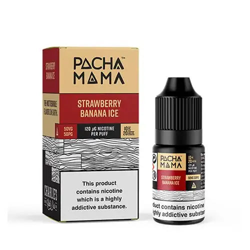 Pacha Mama Strawberry Banana Ice is a mixed fruit blend capturing sweet fresh-picked strawberries with creamy smooth banana, complemented by an ice-cold blast of menthol.