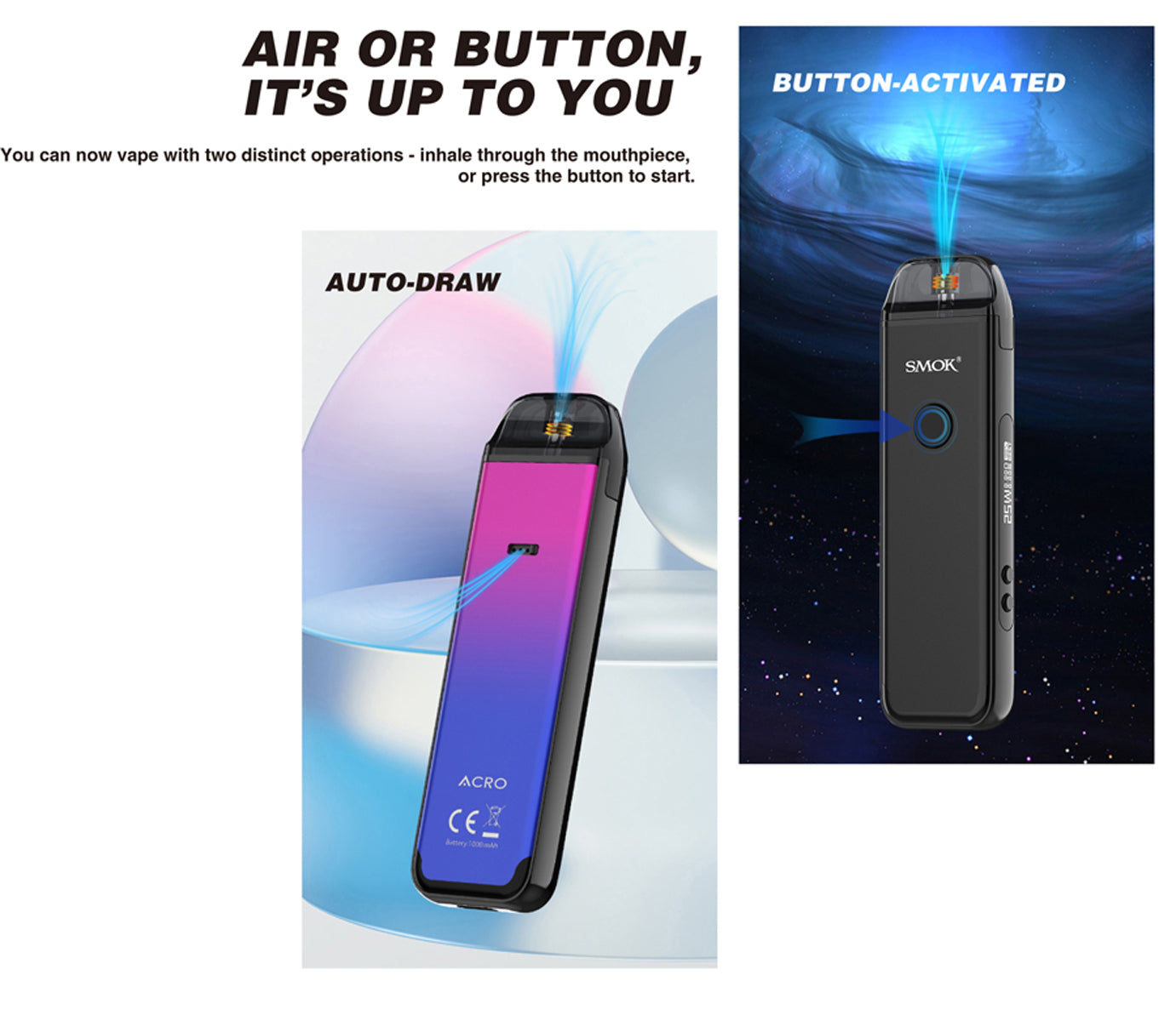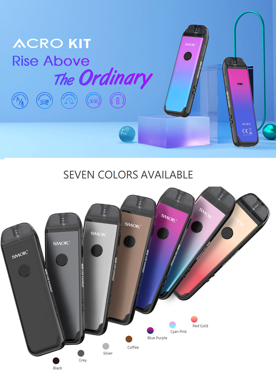 Elevate your vaping journey with the Smok ACRO Kit. A fusion of versatility, style, and performance, this kit is engineered to exceed your expectations. Whether you're seeking adjustable wattage control or a portable companion for your vaping pursuits, the ACRO Kit is ready to deliver an exceptional experience. Embark on your vaping adventure today with the Smok ACRO Kit.
