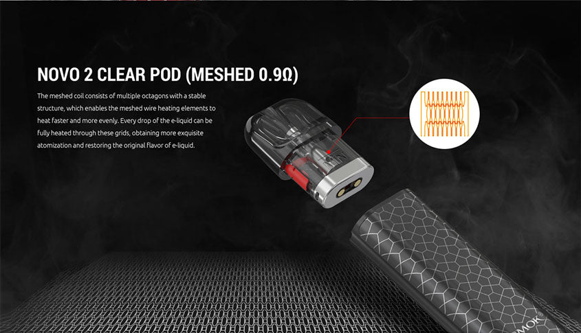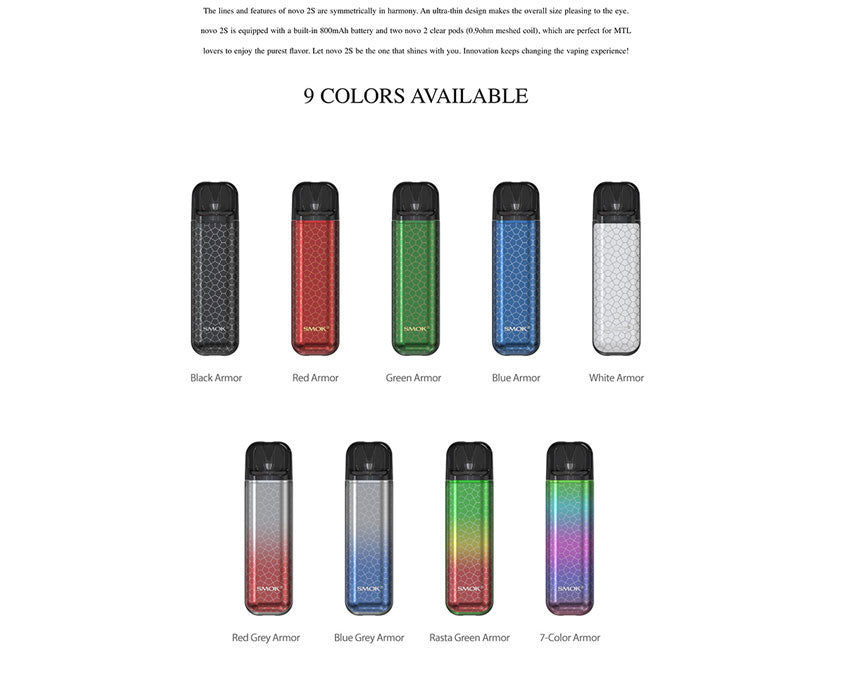 The Smok Novo 2S is a sleek, compact 800mAh draw-activated pod vape kit with clear Novo pods using 0.9Ohm meshed coils for a flavourful MTL vaping experience.