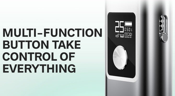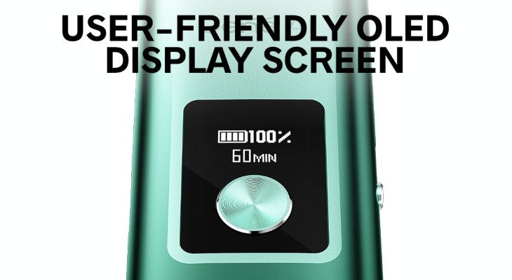 The clear OLED display screen provides essential information at a glance, including battery life, wattage, and more.